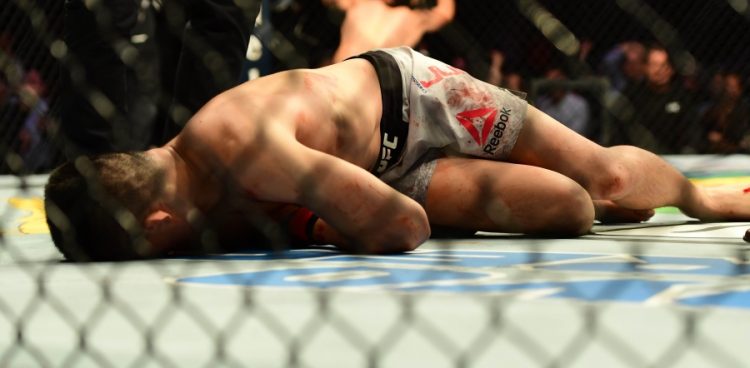 «Он выглядел ужасно, когда мы шли на церемонию взвешивания… Он лежал на полу, будто все еще сгонял вес», — вспоминает Диллашоу. «Потом я иду в туалет, а он бежит туда же, говорит, что его рвет с момента взвешивания. Он ничего не может удержать. Он болен. Возможно, это отчасти нервы, но он ничего не мог в себе удержать. Потом он рассказал, что последние две недели у него был стафилококк, и он принимал антибиотики. Так что, похоже, лагерь прошел неважно. Когда ты на антибиотиках, твоя выносливость будет плохой, и мы это видели в бою».
