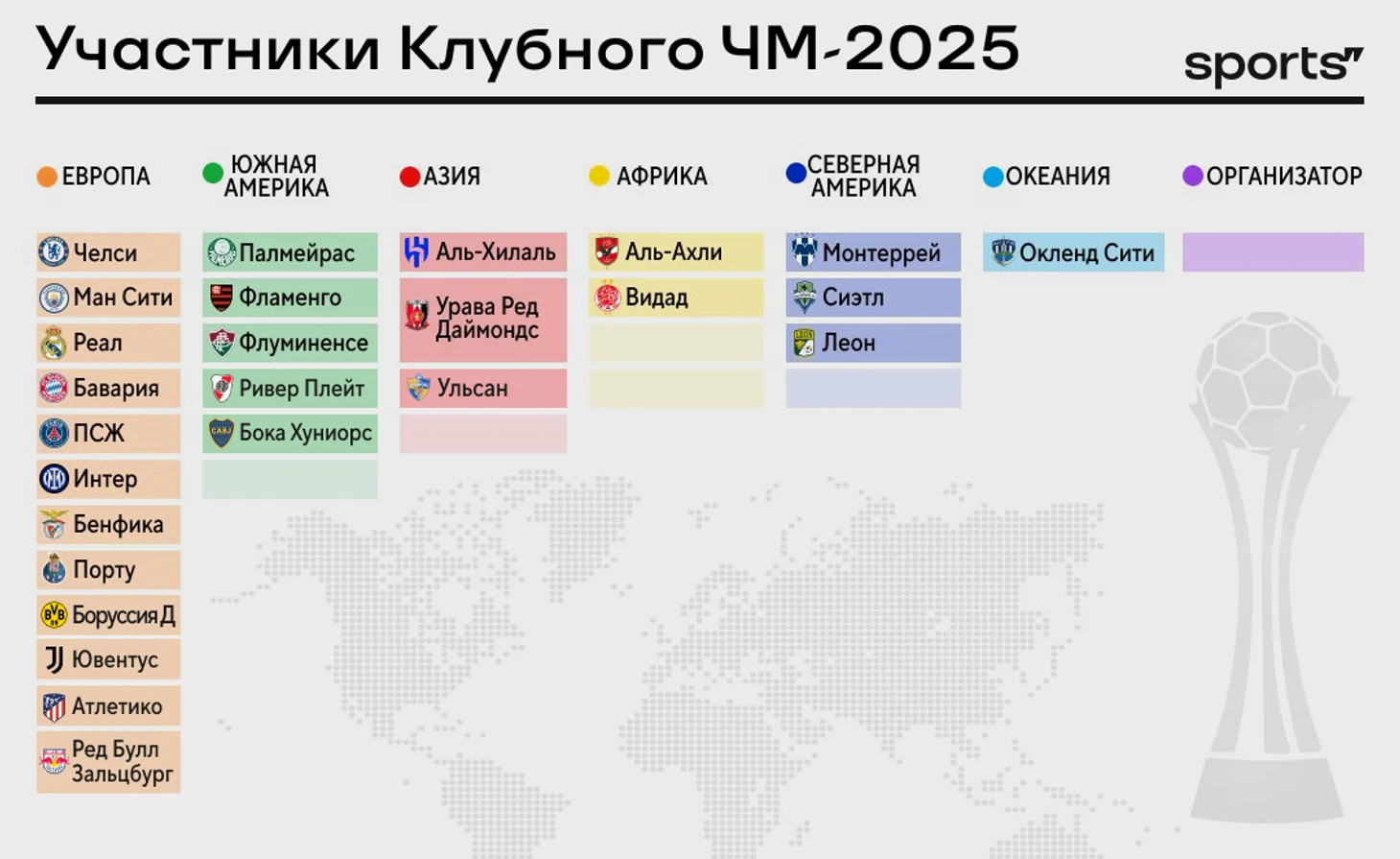 В общей сложности в Клубном чемпионате мира 2025 года примут участие 32 команды, представляющие шесть различных конфедераций.